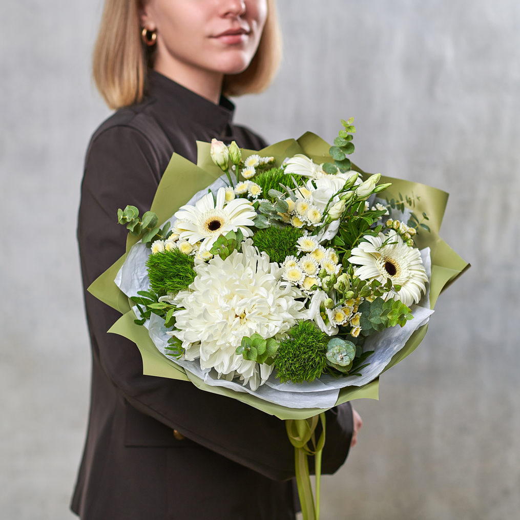 Зеленое очарование летним днем, когда яркое солнце греет каждый сантиметр и хочется зажмуриться от удовольствия, вдохнуть аромат свежих цветов и утонуть в белоснежных герберах. Возможны небольшие изменения элементов. Общий вид и композиция букета будет сохранена.