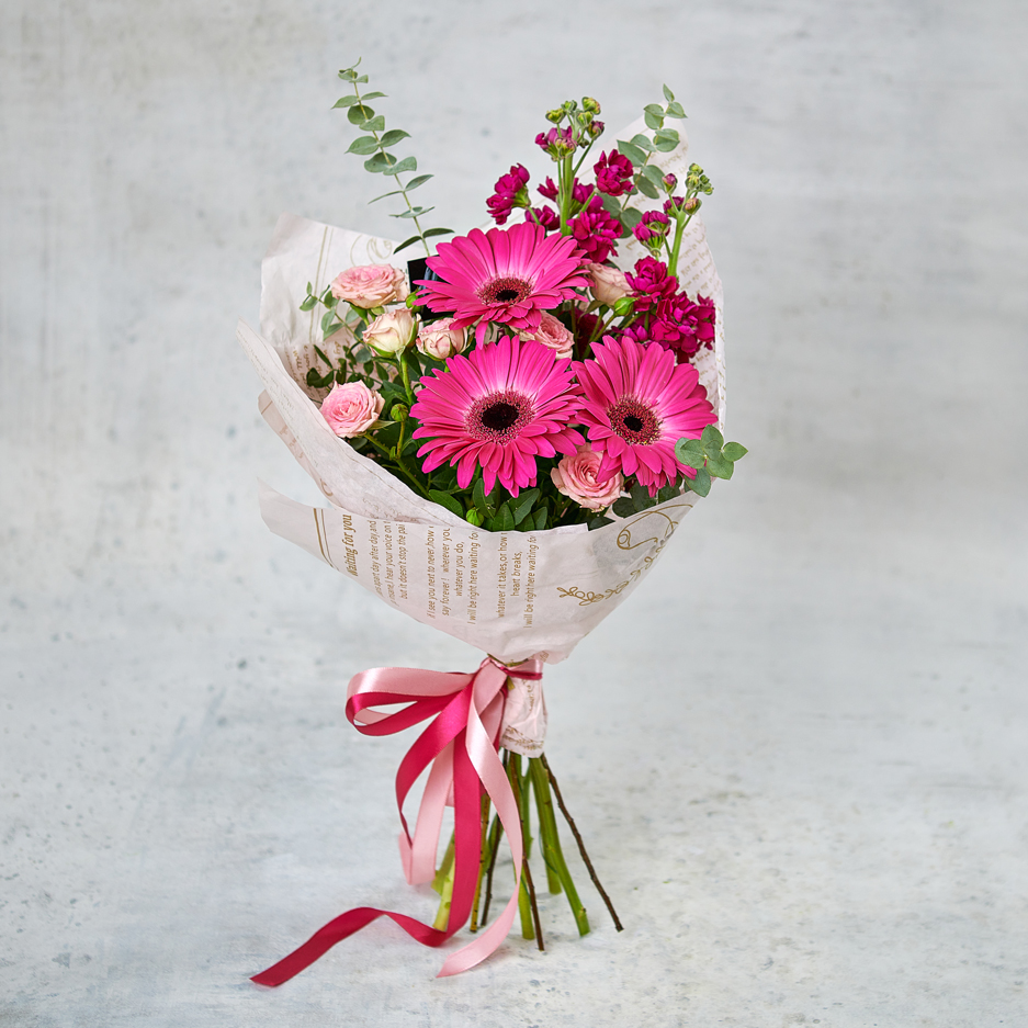 Яркие герберы, нежные розы и ароматный эвкалипт - набор, который запомнится надолго. Возможны небольшие изменения элементов. Общий вид и композиция букета будет сохранена.