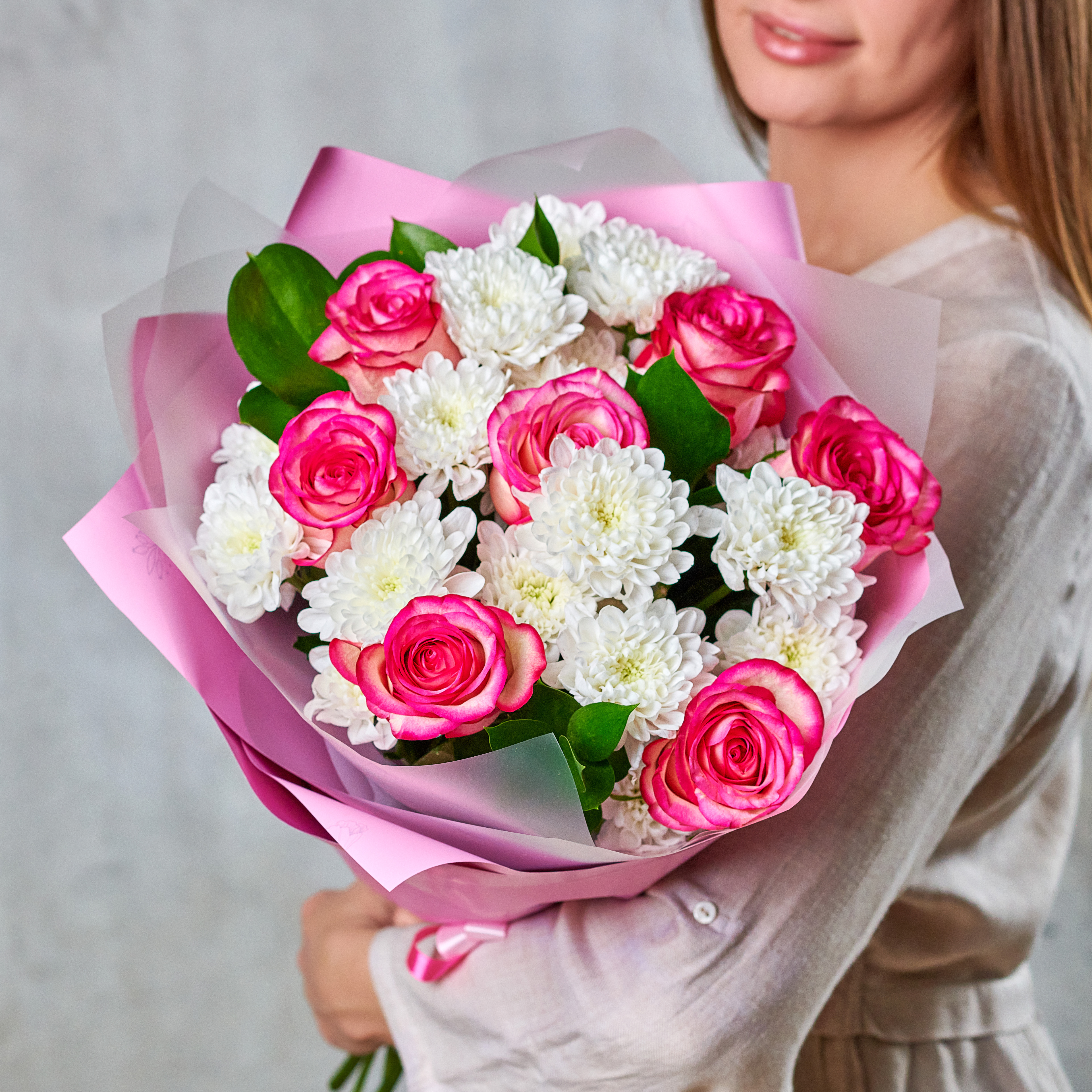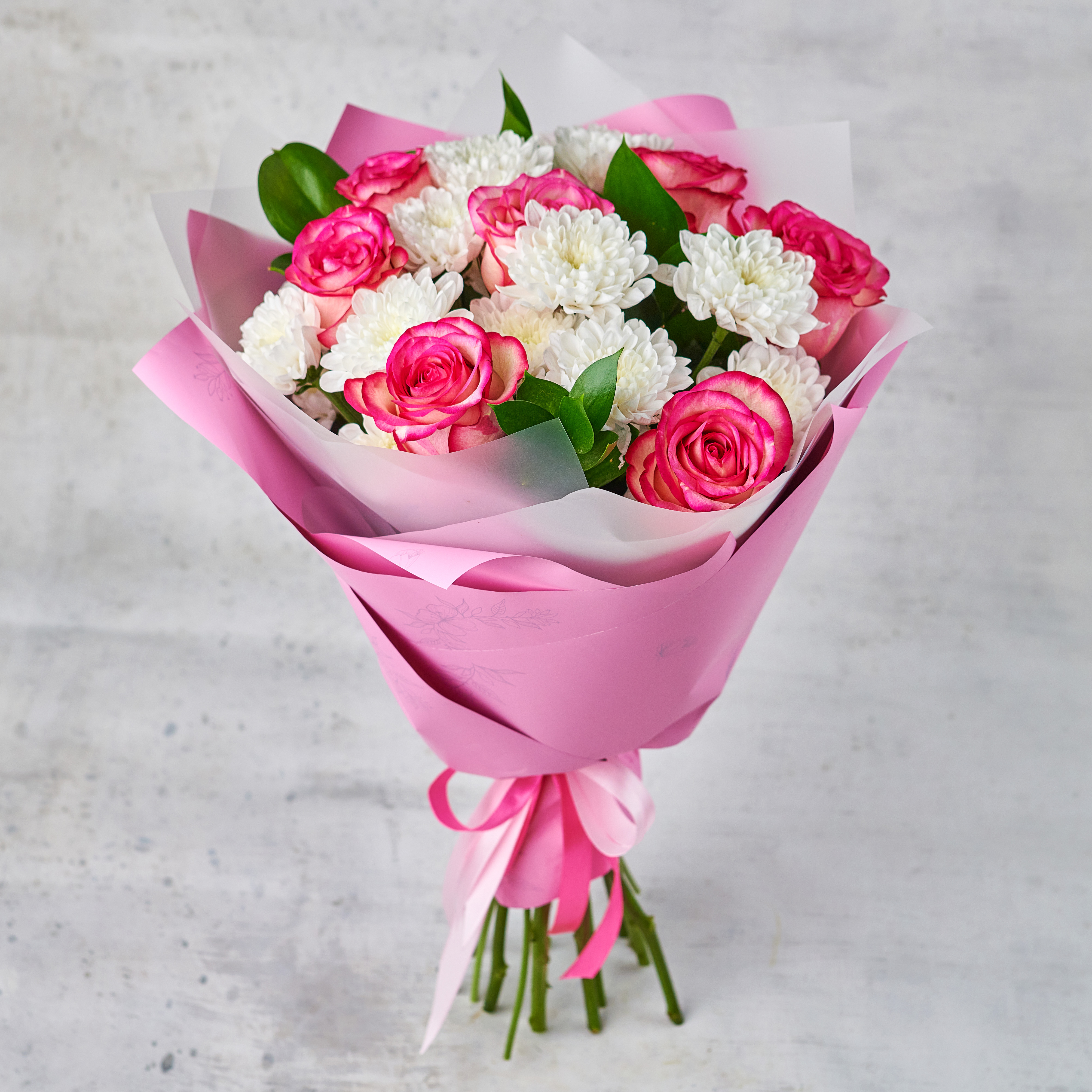 Розы и хризантемы - вечная классика. Один из самых любимых составов наших клиентов, собравший в себя все прелести цветочных полей. Возможны небольшие изменения элементов. Общий вид и композиция букета будет сохранена.