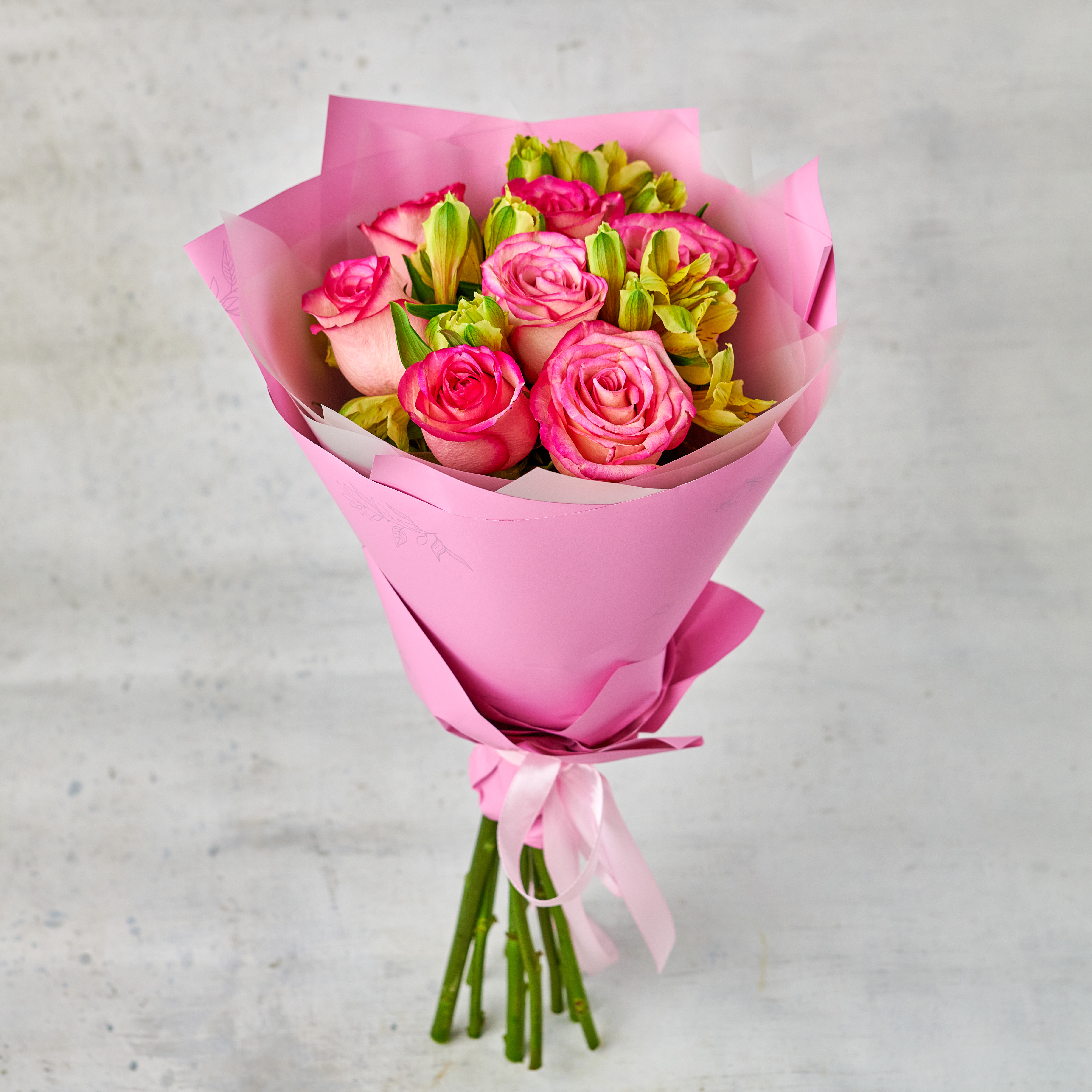 Розовый - идеальный выбор на любой случай. Роскошные розы, перуанские лилии и сочная упаковка - состав? покоривший сердца миллионов. Возможны небольшие изменения элементов. Общий вид и композиция букета будет сохранена.