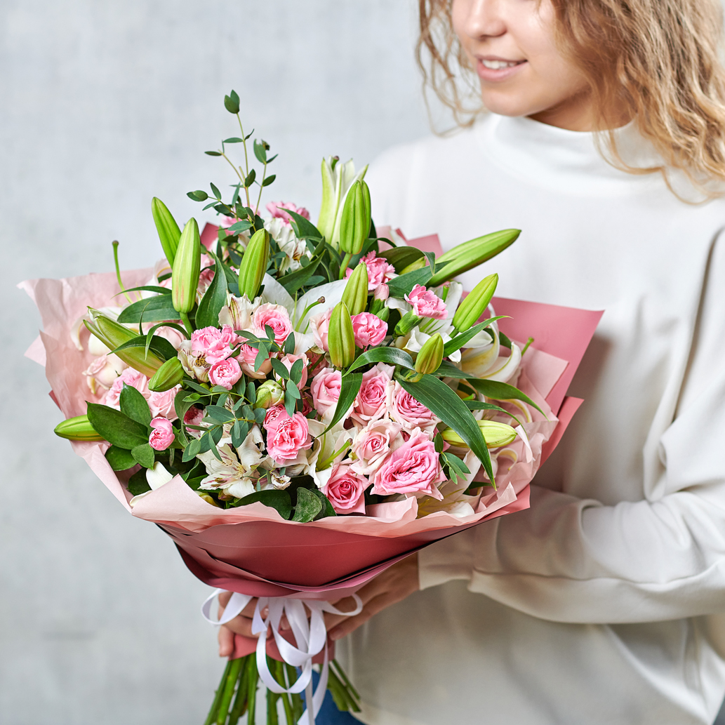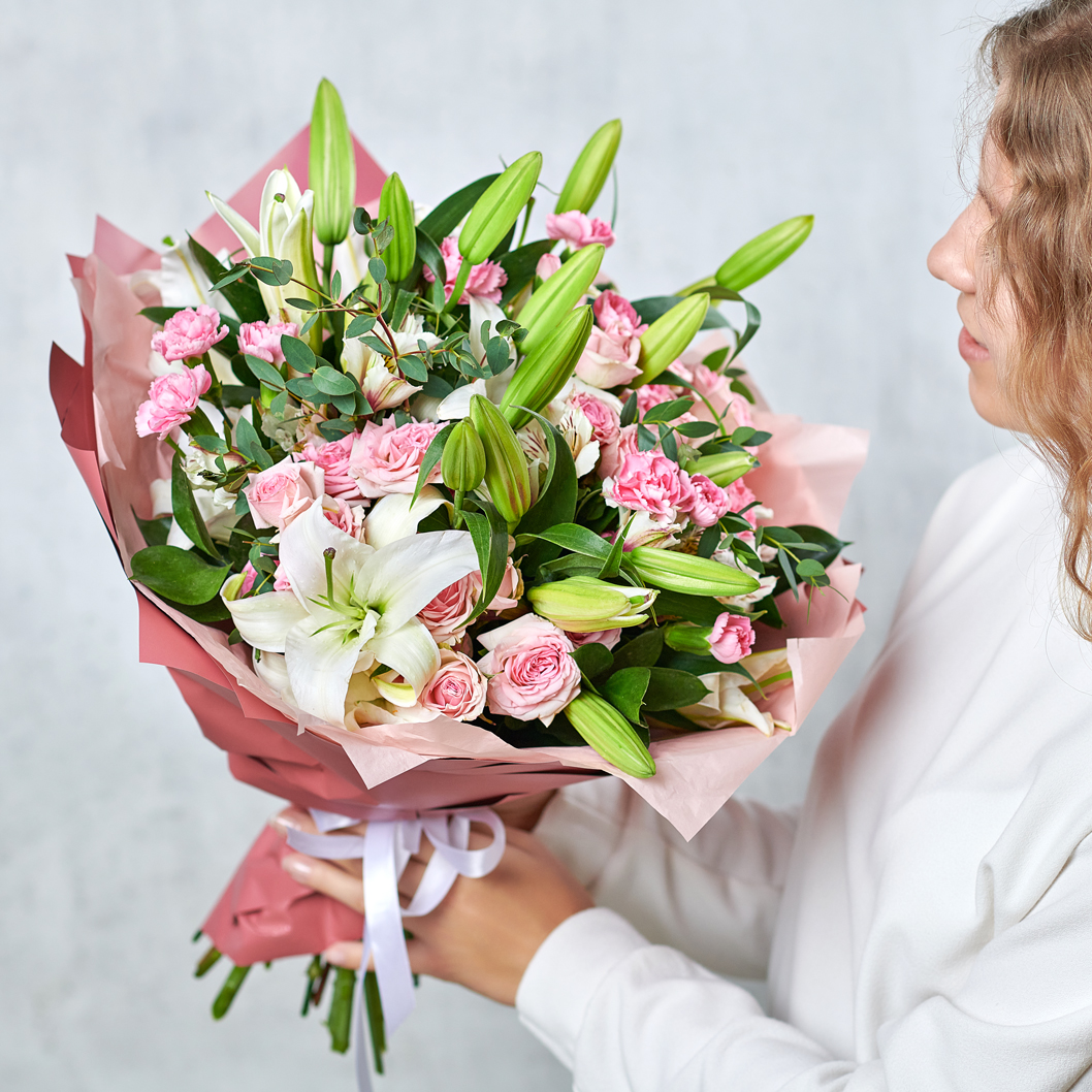 Кустовая роза, романтичная белоснежная лилия, эвкалипт, подчеркивающий каждую деталь. Такой набор прекрасно подойдет как юным девушкам, так и взрослым дамам. Классическая упаковка, универсальная цветовая гамма - подарок, выбранный со вкусом. Возможны небольшие изменения элементов. Общий вид и композиция букета будет сохранена.