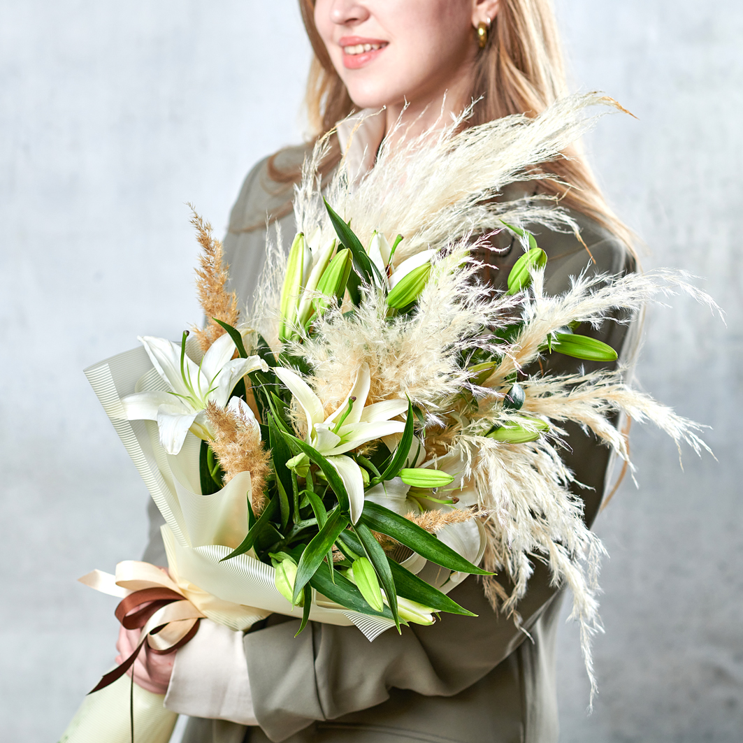 Лилия - один из самых благородных цветов. Ее в качестве своего символа выбирали короли. В сочетании с пышной кортадерией лилия создает изящный вытянутый силуэт. Трендовые перья и воздушная упаковка - безупречный подарок для настоящих эстетов. Возможны небольшие изменения элементов. Общий вид и композиция букета будет сохранена.