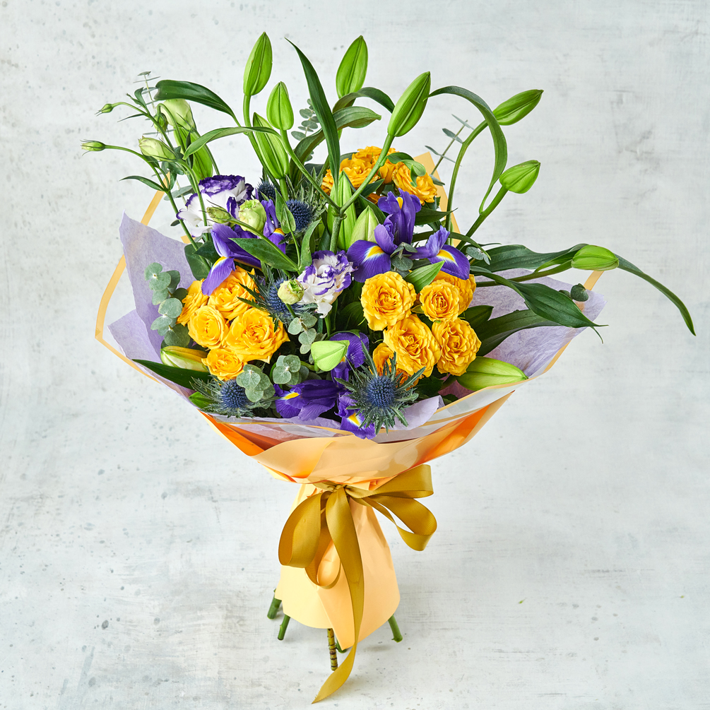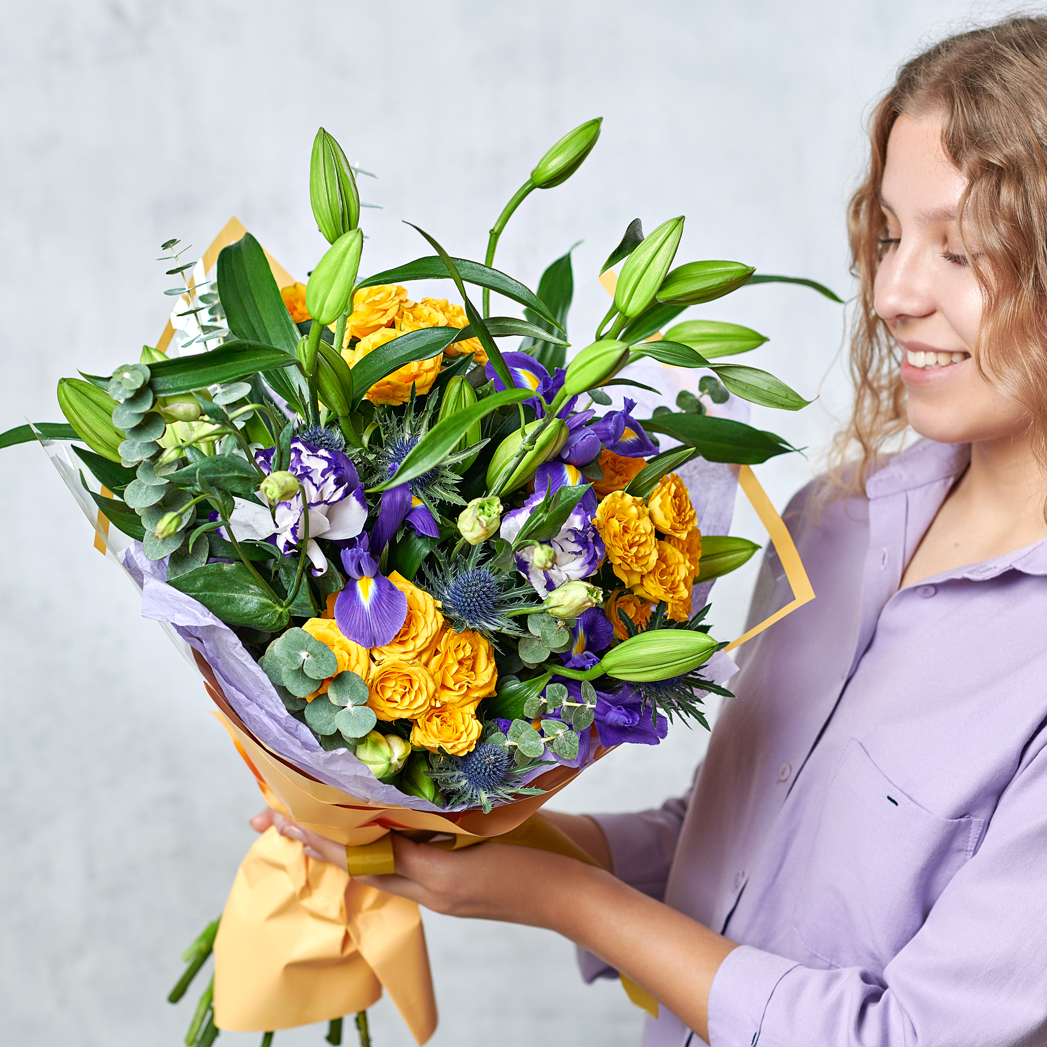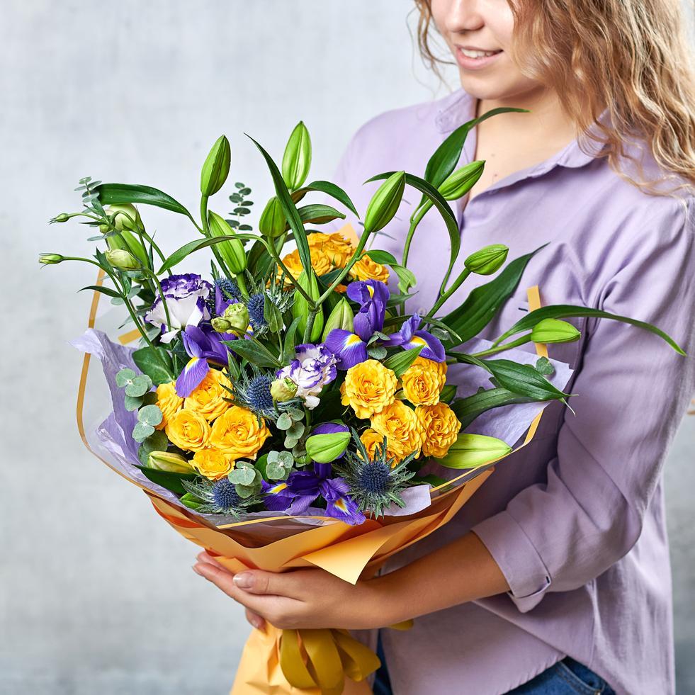 Солнечные розы, фиолетовые ирисы и кустистая лилия - теплое сочетание для летних джазовых вечеров в богатой цветовой палитре. Возможны небольшие изменения элементов. Общий вид и композиция букета будет сохранена.