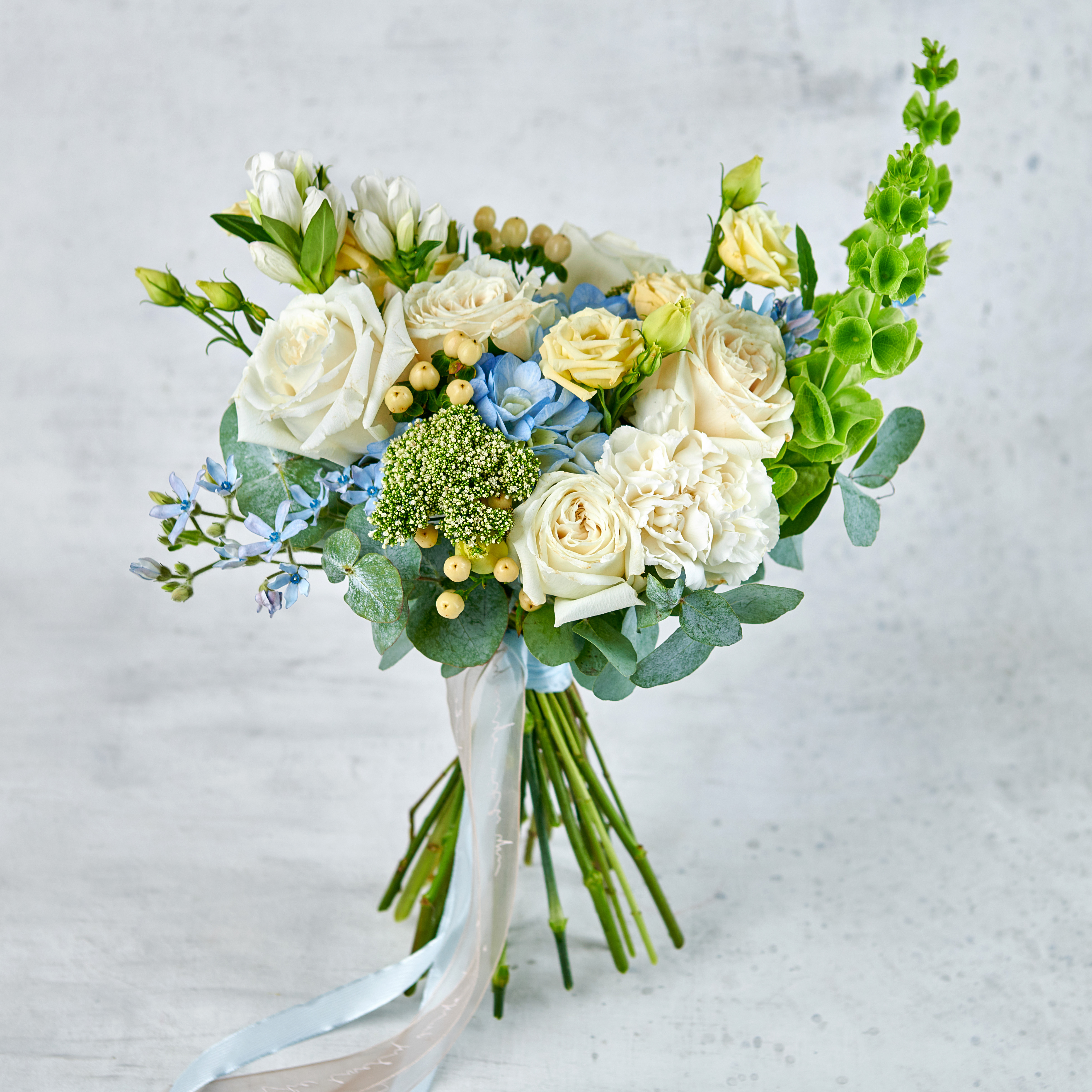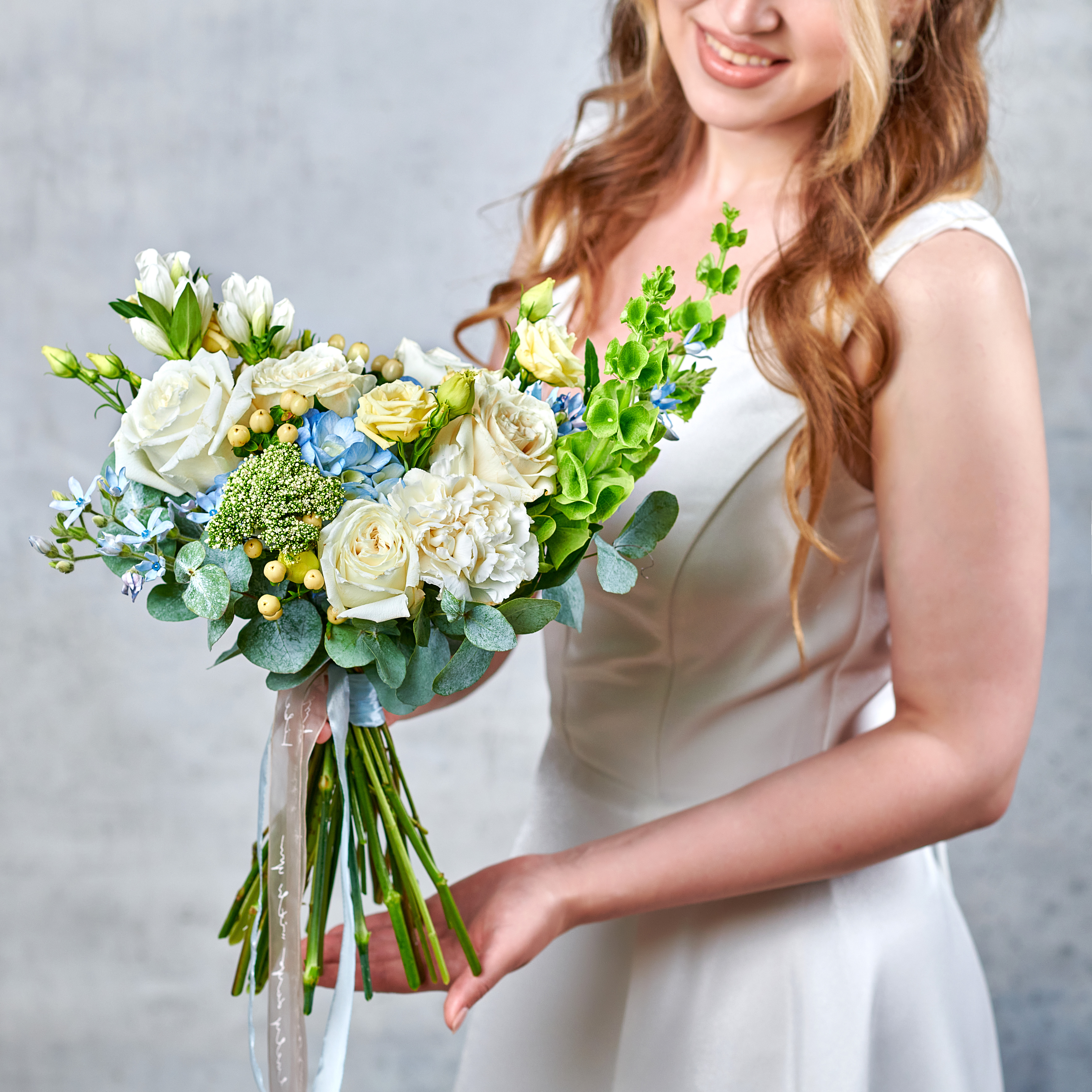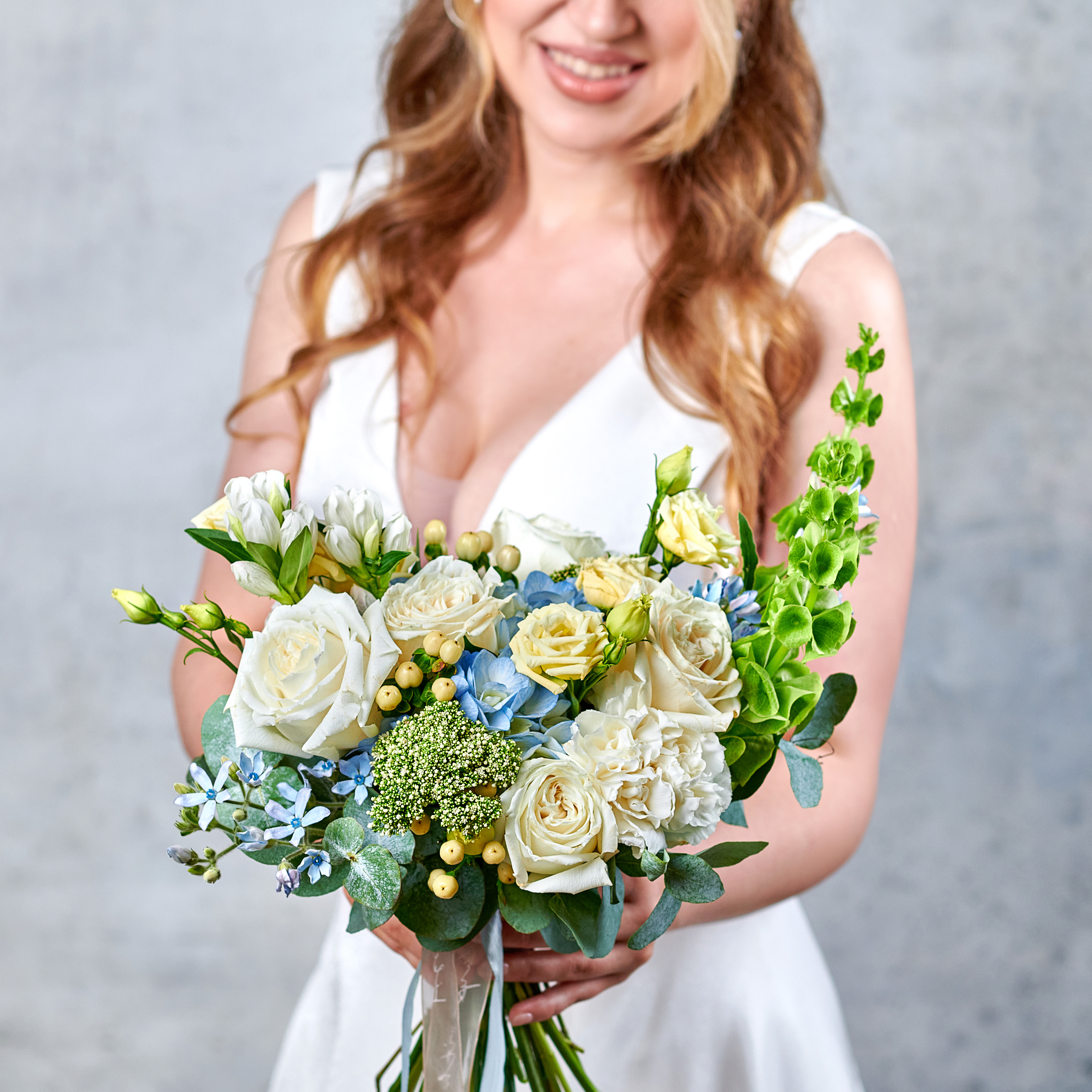 Облака с небесными отливами в современной форме и классическими акцентами - идеальное решение для трогательных моментов, наполненных нежностью и легкостью летнего неба. Возможны небольшие изменения элементов. Общий вид и композиция букета будет сохранена.