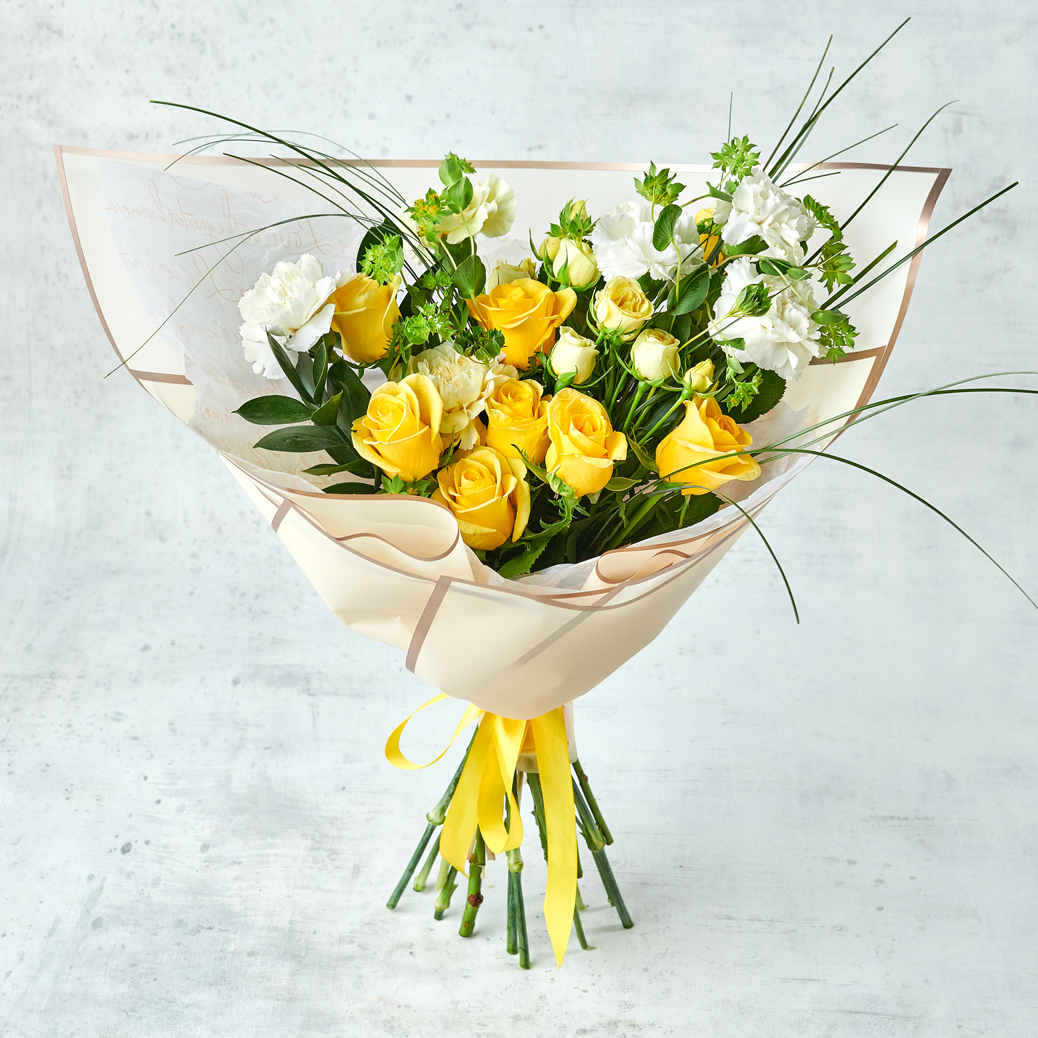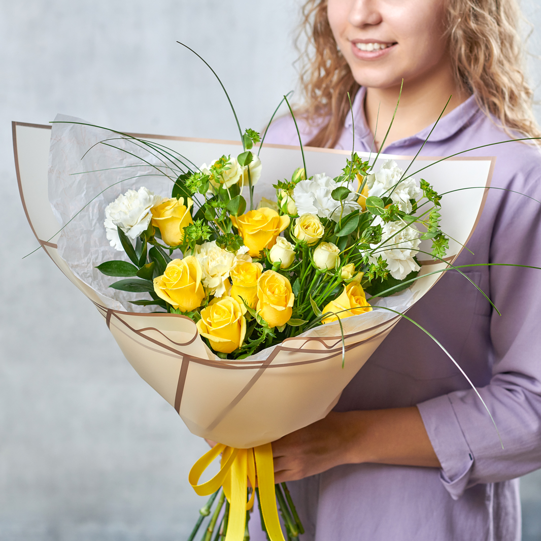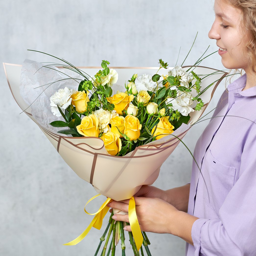 Нежные розы, воздушные диантусы в солнечном исполнении поднимут настроение и согреют теплыми улыбками. Возможны небольшие изменения элементов. Общий вид и композиция букета будет сохранена.