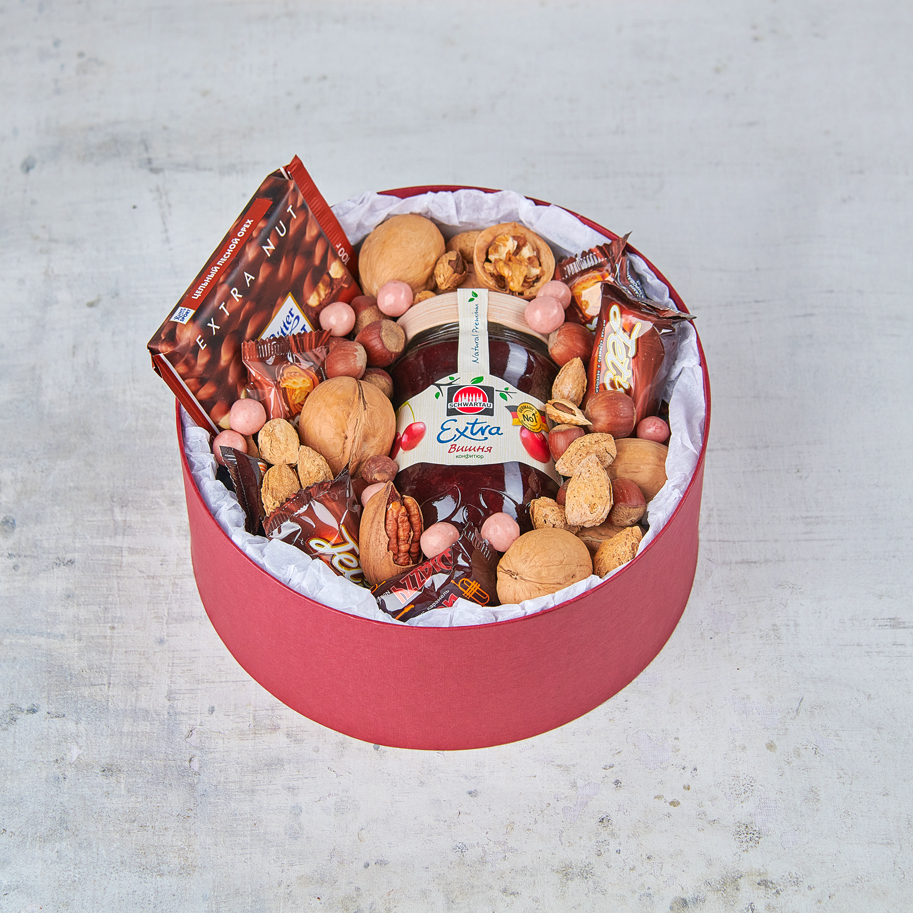 Идеальный выбор для тех, кто любит дарить полезные подарки. В составе микс орехов, богатых белками и жирами, десерт из вишневого варенья и сладких сюрпризов.Возможны небольшие изменения элементов. Общий вид и композиция букета будет сохранена.