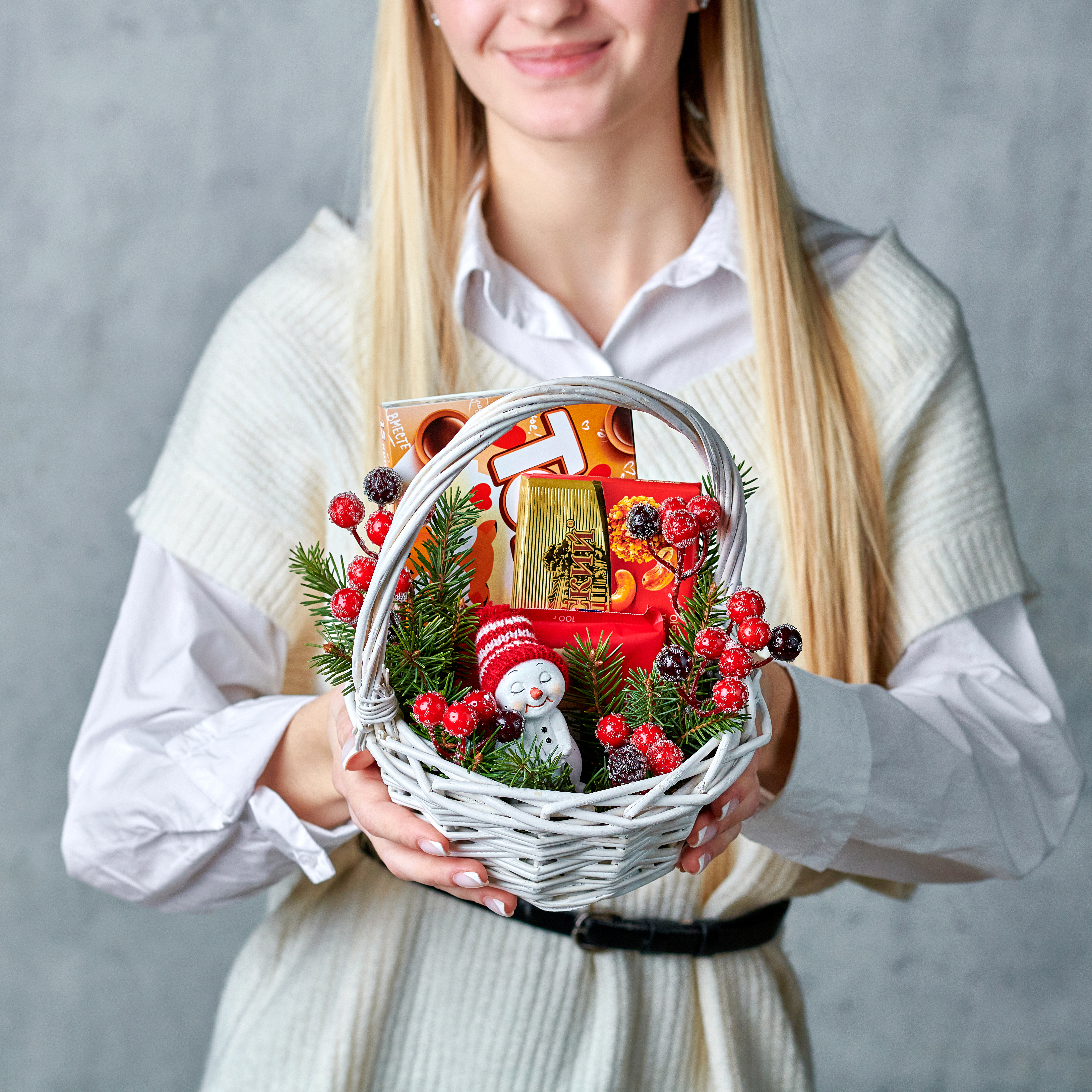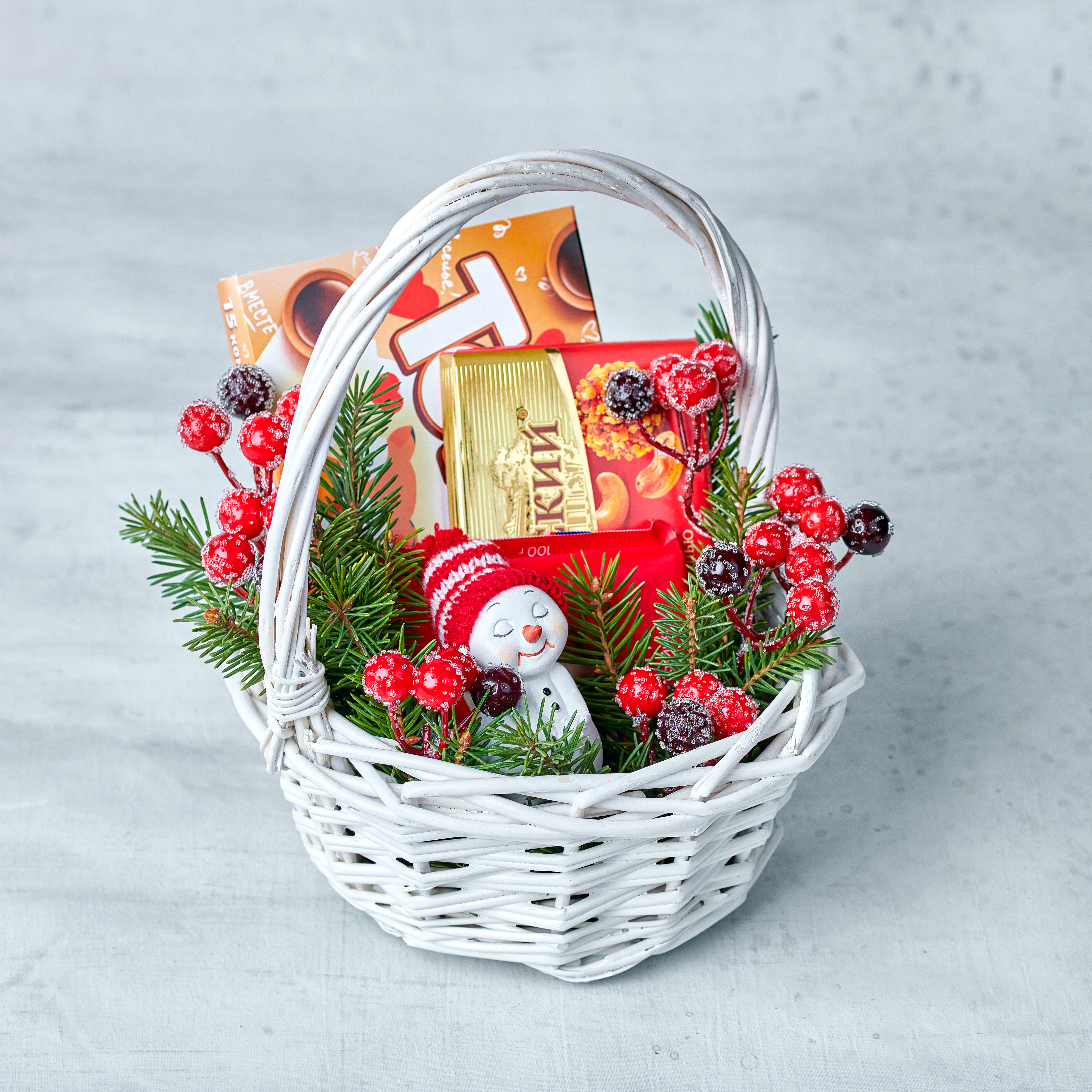 Теплые, зимние и очень вкусные - такими представляются подарки к новому году. Добавьте волшебства и заботы. Возможны небольшие изменения элементов. Общий вид и композиция букета будет сохранена.