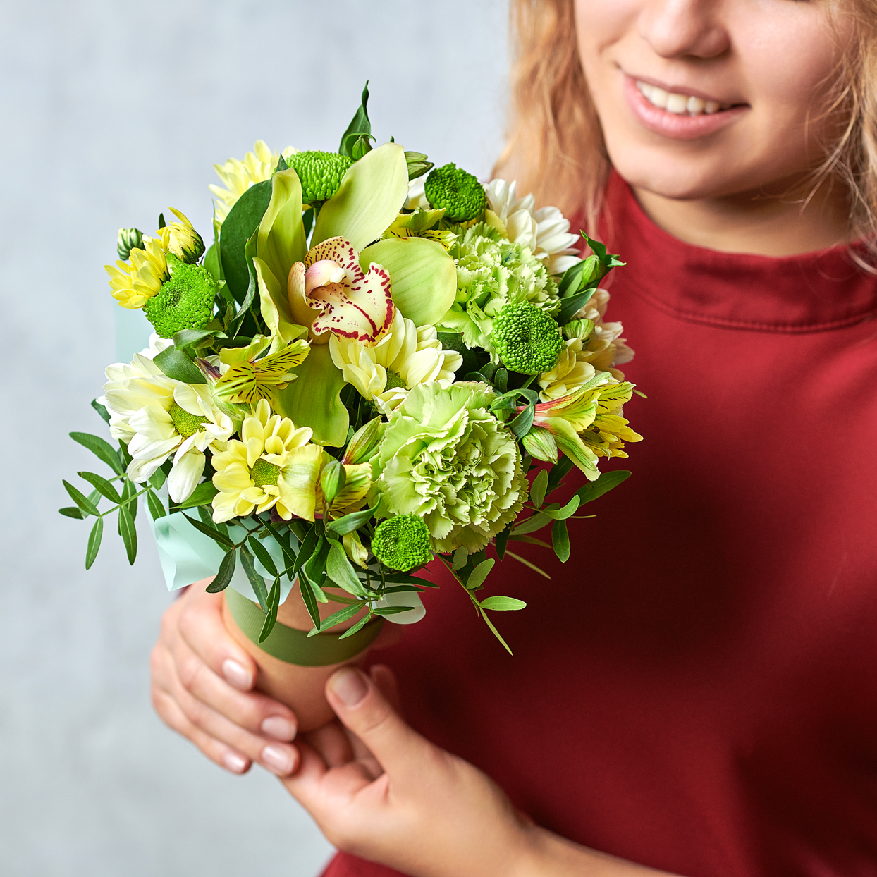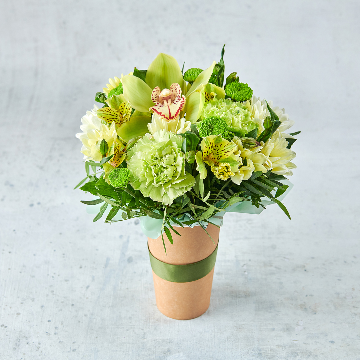 Лаймовый микс кружевных диантусов и тропической орхидеи станет прекрасным дополнением к подарку на день рождения, в качестве презента на встрече. Возможны небольшие изменения элементов. Общий вид и композиция букета будет сохранена.