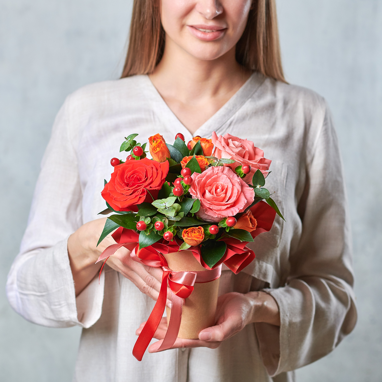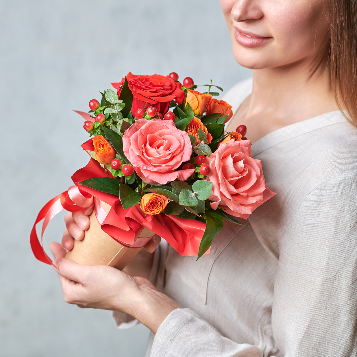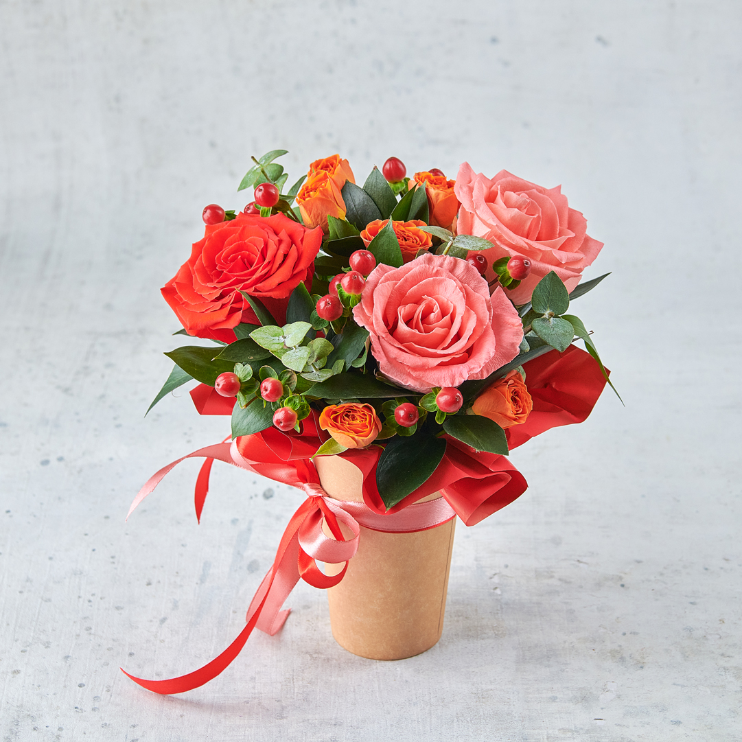 Страстный и искренний, словно танец Матисса, микс из ягод гиперикума и символа любви, красной розы. Такой подарок точно заставит сердце биться чаще. Возможны небольшие изменения элементов. Общий вид и композиция букета будет сохранена.