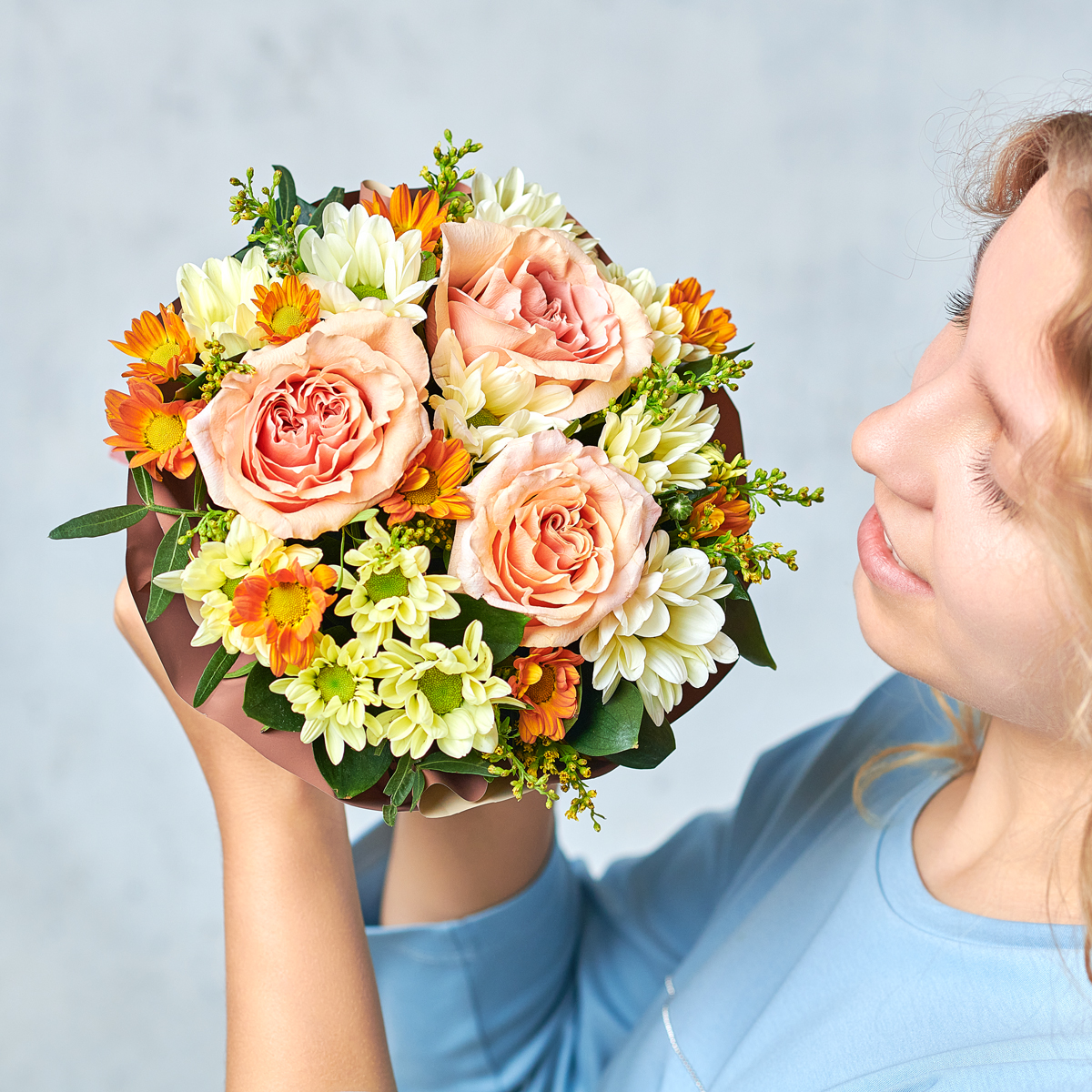Персиковые оттенки в теплом и уютном исполнении. Возможны небольшие изменения элементов. Общий вид и композиция букета будет сохранена.