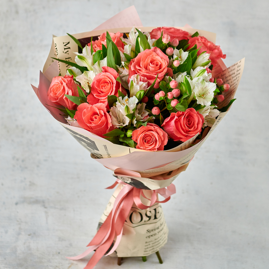 Вечная классика для любителей ярких и жизнерадостных деталей. Любимая всеми роза "Амстердам", подчеркнутая нежностью альстромерий и элегантными ягодками гиперикума. Возможны небольшие изменения элементов. Общий вид и композиция букета будет сохранена.