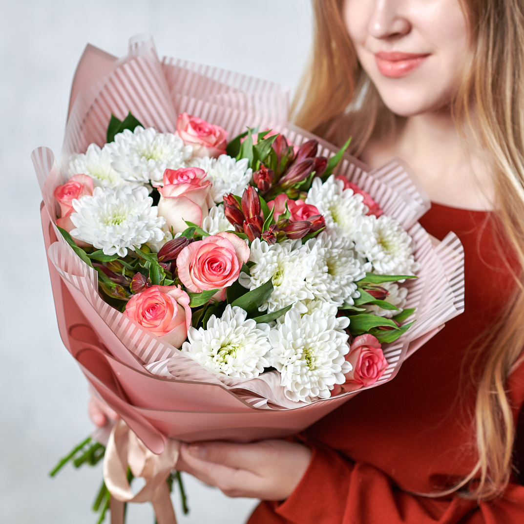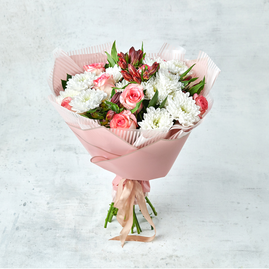 Пушистые ветви хризантем, эквадорские розы и перуанские лилии, подчеркнутые текстурной упаковкой создадут атмосферу утреннего леса на рассвете с поющими переливами птиц. Возможны небольшие изменения элементов. Общий вид и композиция букета будет сохранена.