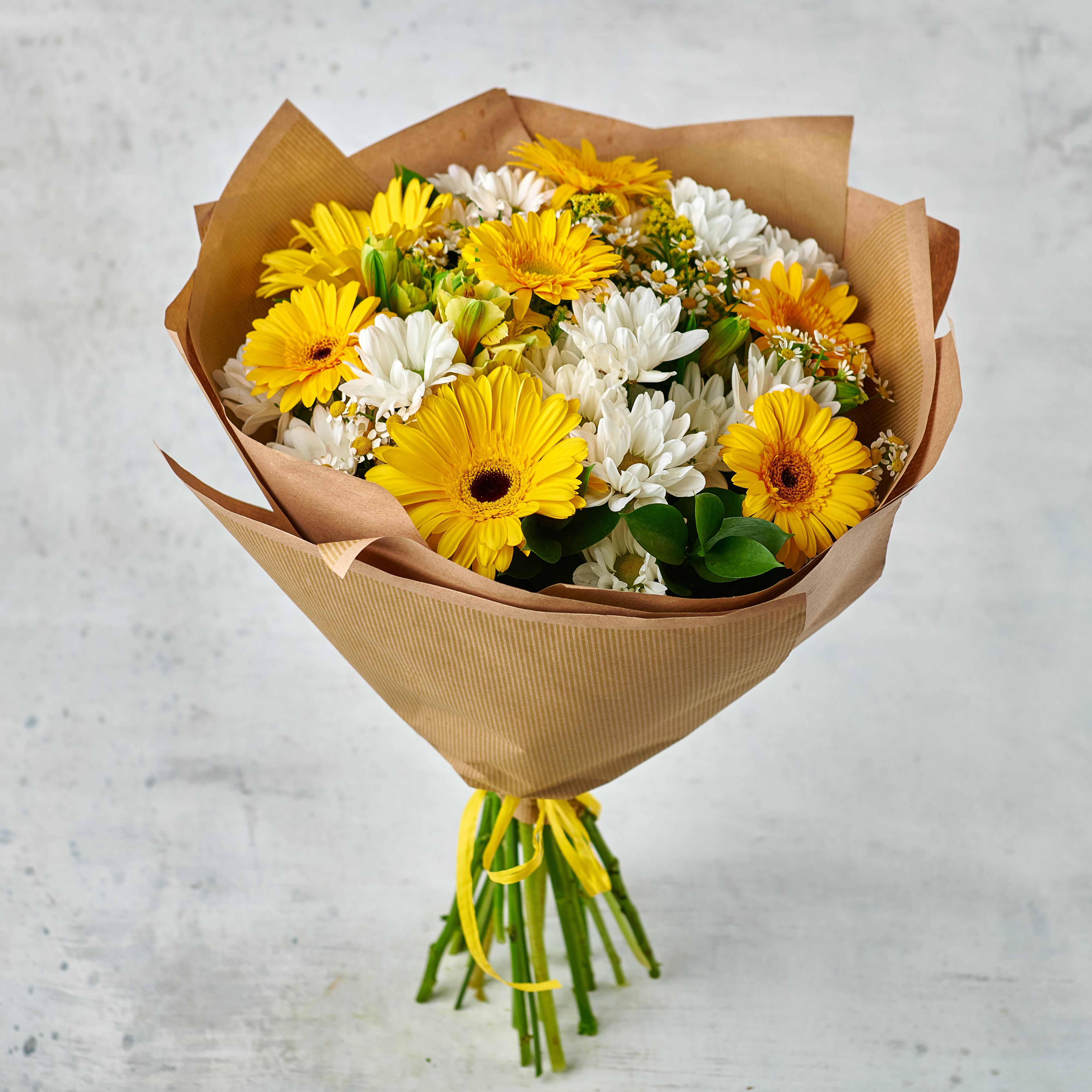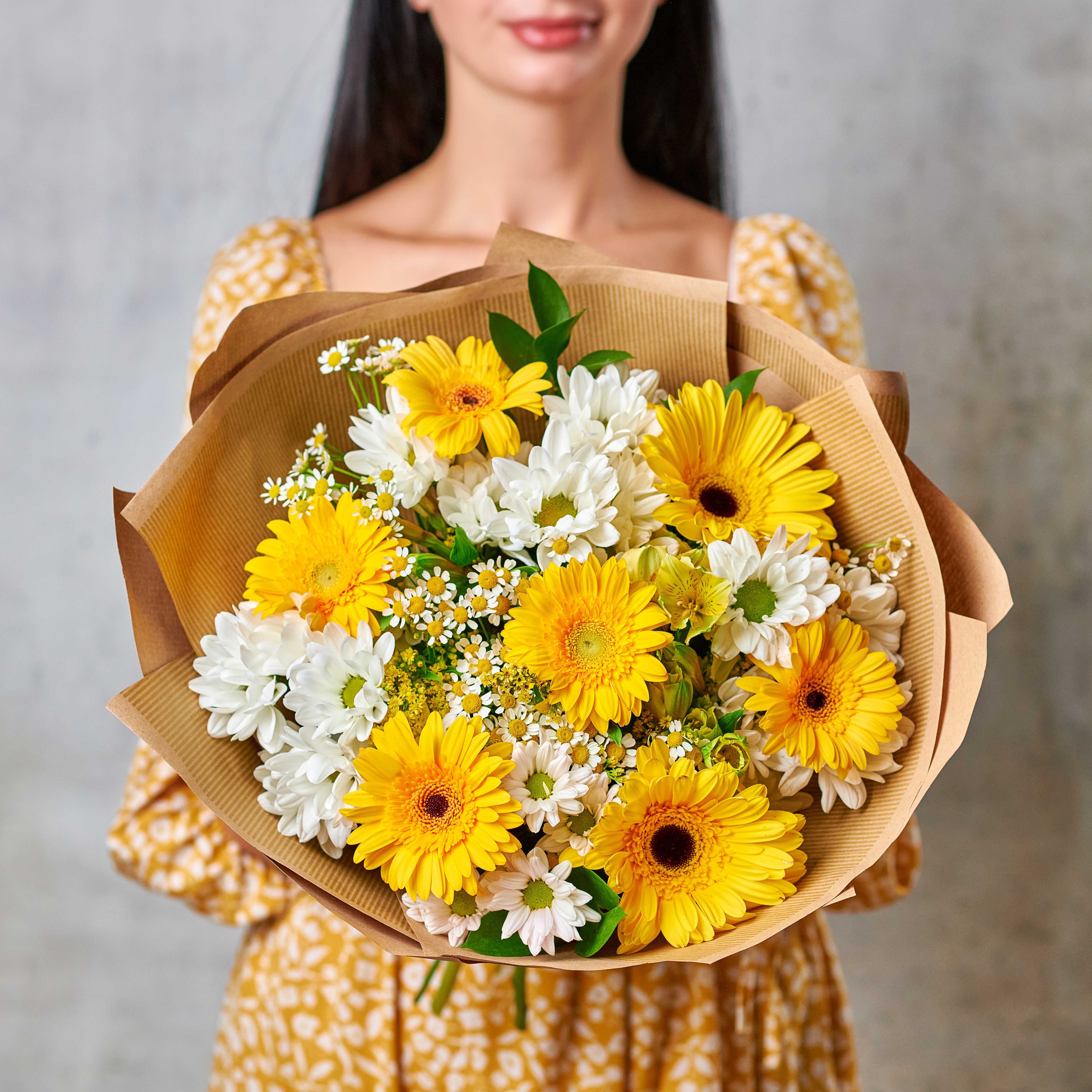 Букет наполненный счастьем, солнцем и летними веснушками из ромашек всех видов. Идеальный подарок для романтичных и мечтательных натур, а также прекрасный выбор в день семьи, любви и верности. Возможны небольшие изменения элементов. Общий вид и композиция букета будет сохранена.