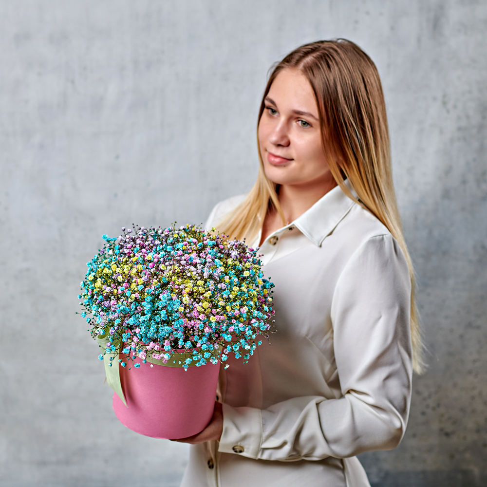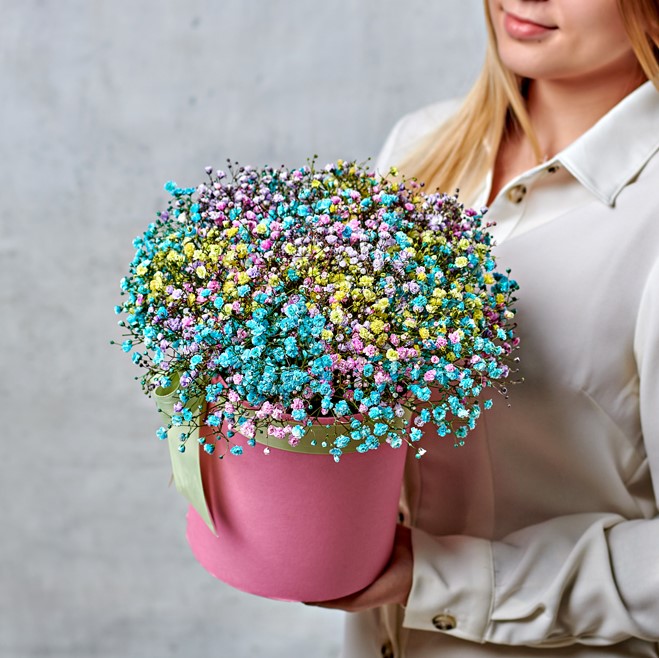 Пушистое облако россыпи цветных бутонов в милой коробочке - подарок, который тронет до глубины души. Гипсофила уникальный цветок, который сохраняет свою форму даже после высыхания, может служить декоративным украшением интерьера в качестве сухоцвета. Возможны небольшие изменения элементов. Общий вид и композиция букета будет сохранена.