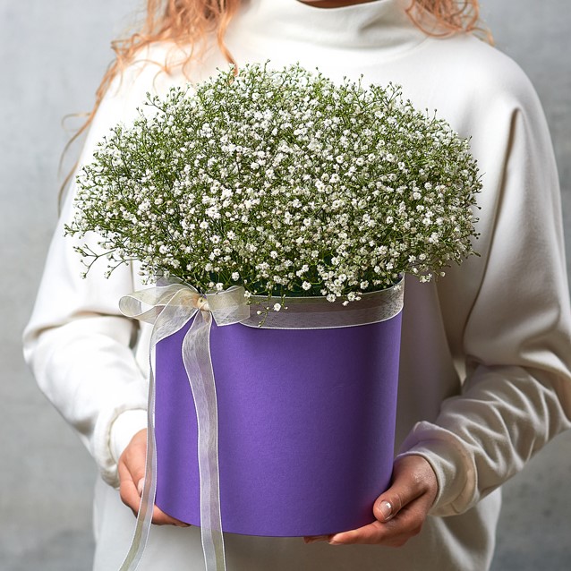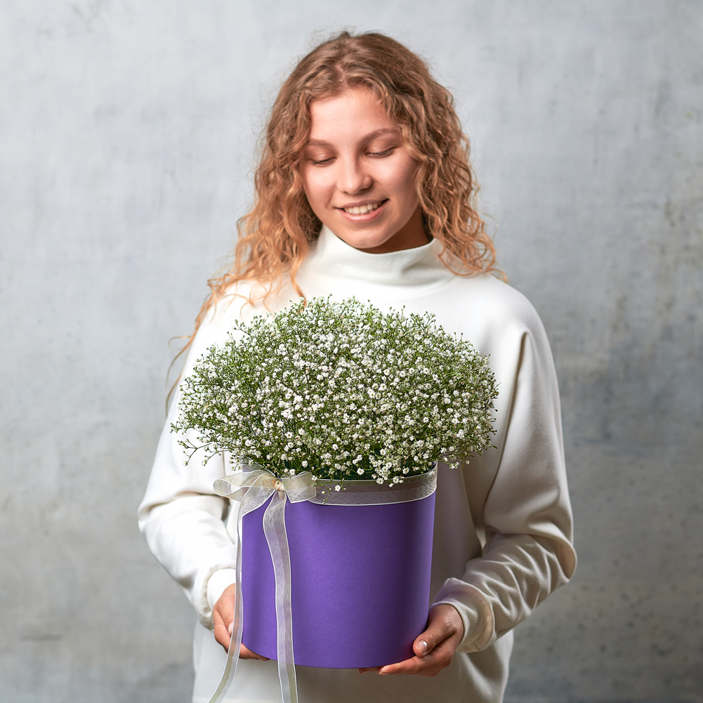Настоящий хит цветочных подарков - снежная гипсофила. Такой подарок точно вызовет восторг и будет радовать получателя очень долго, так как гипсофила сохраняет свой вид даже после высыхания, нередко используется в качестве сухоцвета и декоративного элемента. Возможны небольшие изменения элементов. Общий вид и композиция букета будет сохранена.