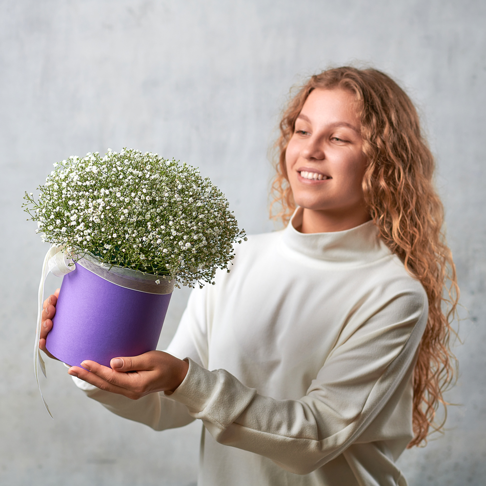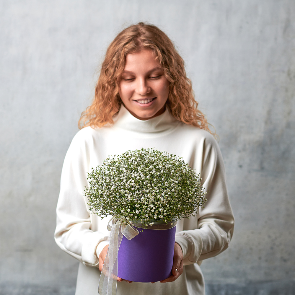 Настоящий хит цветочных подарков - снежная гипсофила. Такой подарок точно вызовет восторг и будет радовать получателя очень долго, так как гипсофила сохраняет свой вид даже после высыхания, нередко используется в качестве сухоцвета и декоративного элемента. Возможны небольшие изменения элементов. Общий вид и композиция букета будет сохранена.