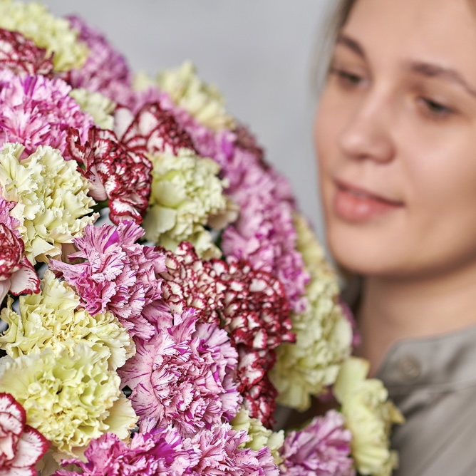 Диантусы или же гвоздики в древней Греции считались самым праздничным цветком, а само название буквально переводится как «цветы богов». Такой букет все больше набирает популярность благодаря своей стойкости и безупречному виду. Каждый бутон напоминает пион, а тонкий гвоздичный аромат, подарит незабываемые впечатления.