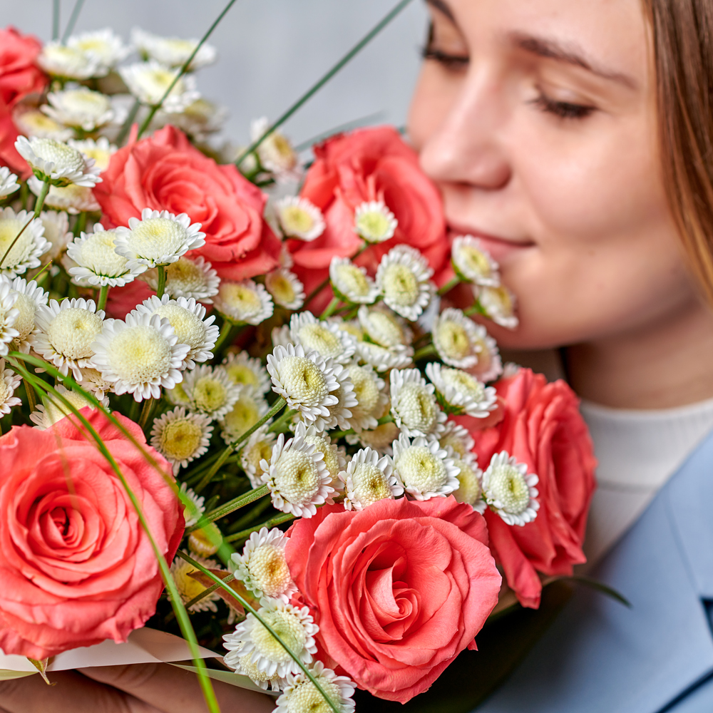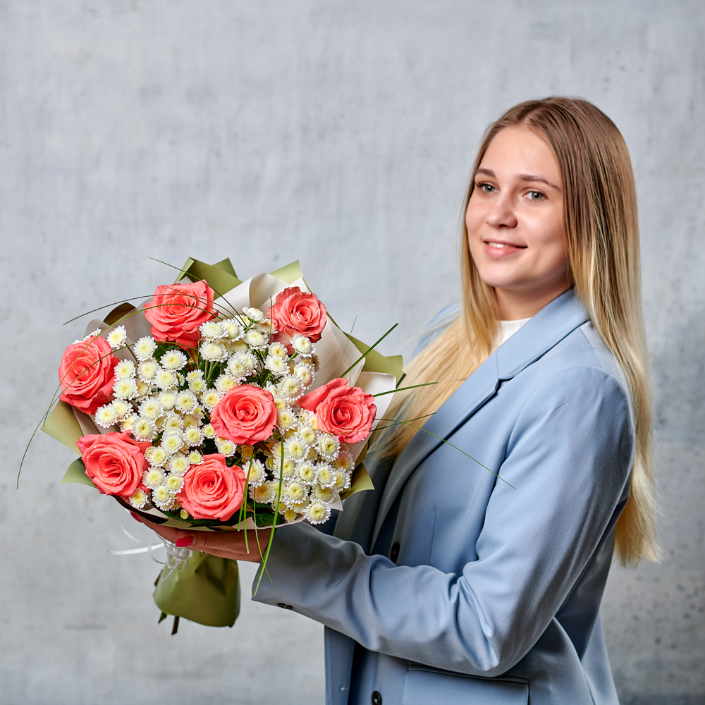 Волшебные бутоны, подчеркнутые белоснежной хризантемой создадут незабываемый контраст, оформленный в натуральный благородный глубокий зеленый оттенок. Идеальный букет, который подойдет для любого повода. Возможны небольшие изменения элементов. Общий вид и композиция букета будет сохранена.