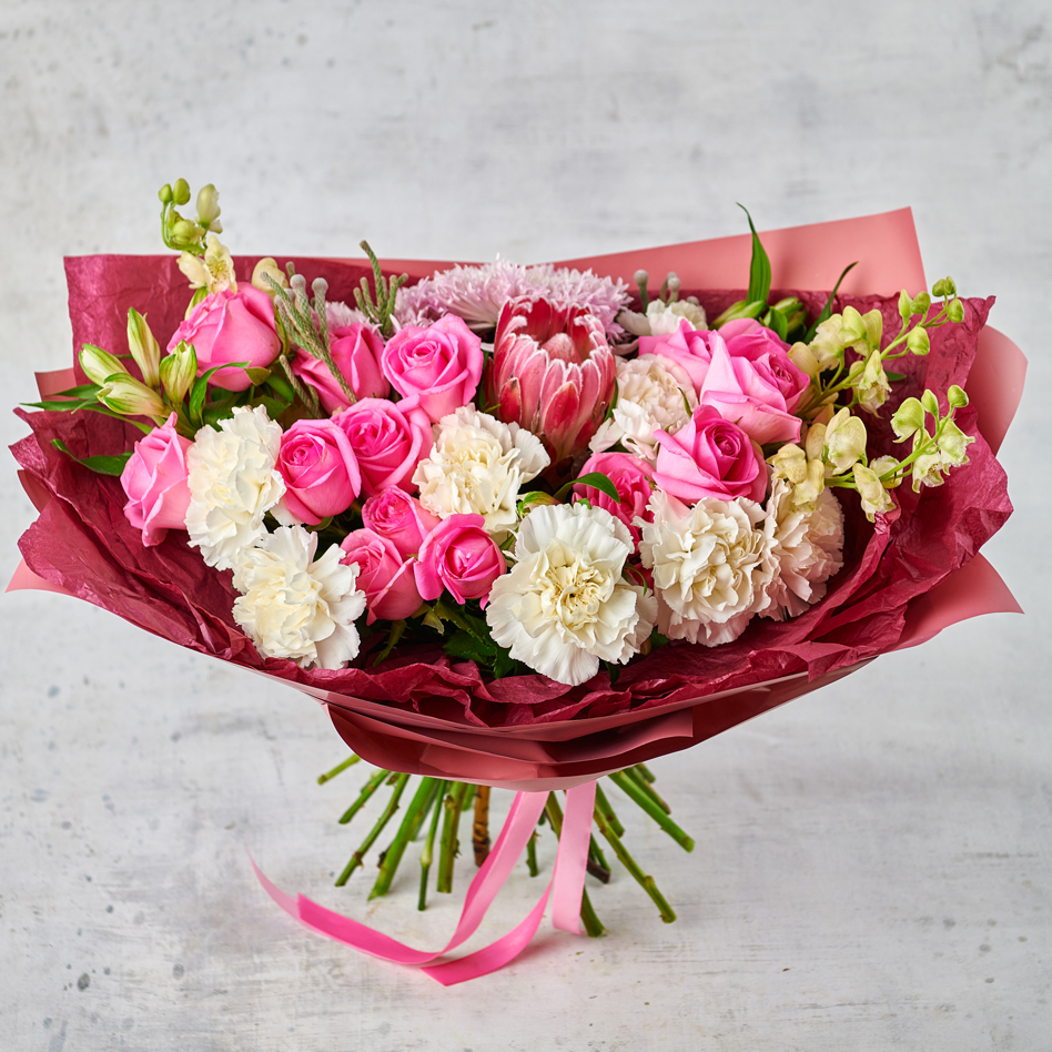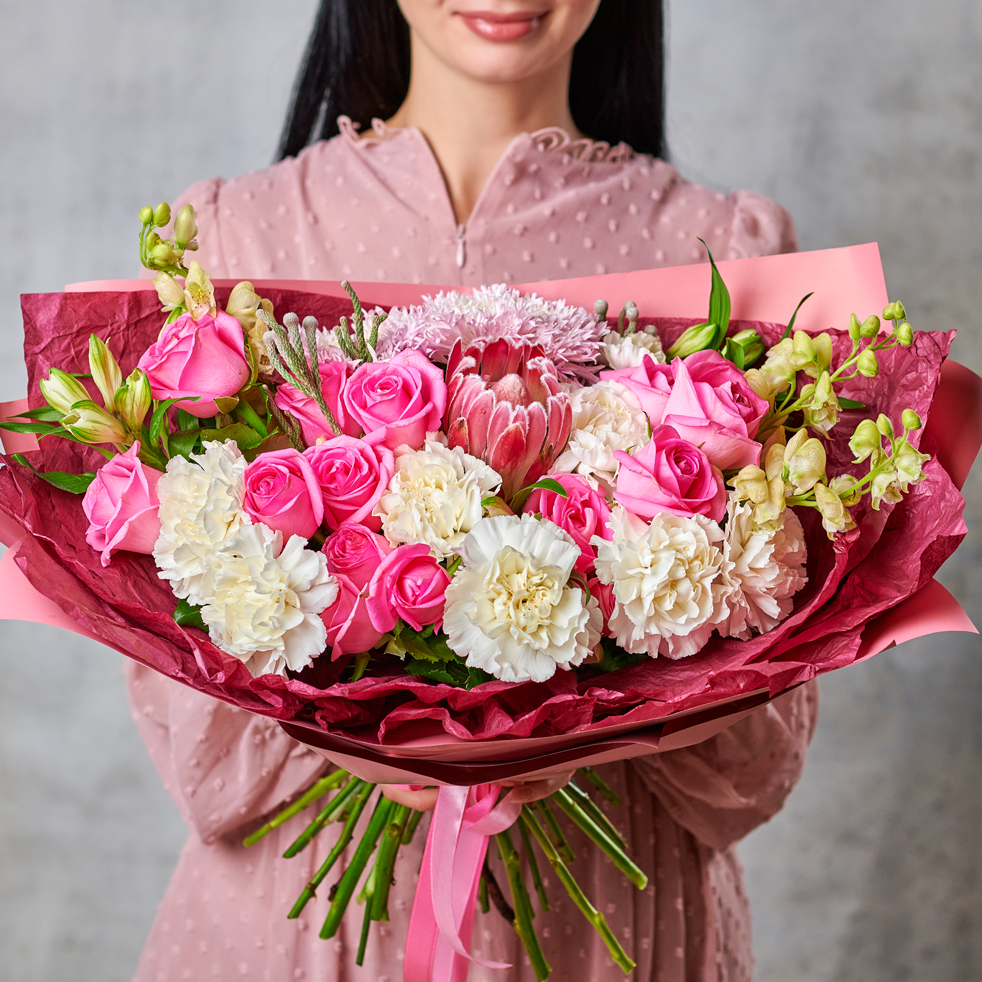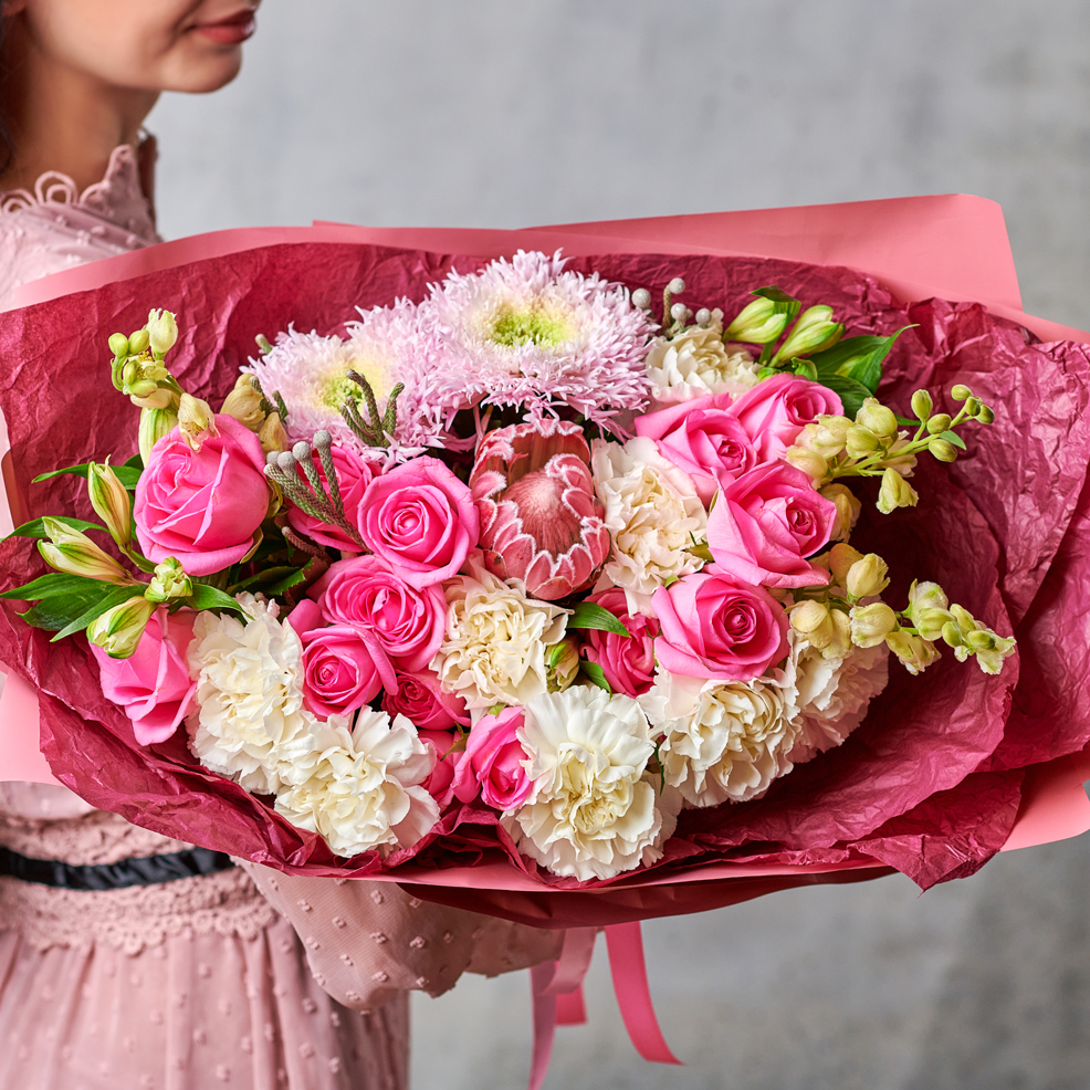 Цветок, названый африканской розой, символ любви, - безупречная протея. Букеты с протеей подойдут тем, кто ценит многогранность фактур и форм, очарован жаркими странами и просто обожает красивые жесты. Букет с протеей поможет выразить самые глубокие чувства и сказать "люблю" на всех языках мира. В составе присутствует сезонный цветок, может быть заменен, исходя из наличия товара. Возможны небольшие изменения элементов. Общий вид и композиция букета будет сохранена.